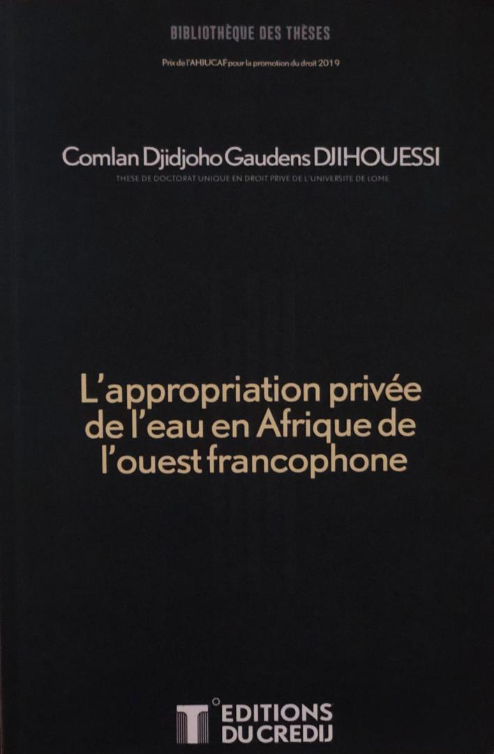 L’eau est un bien dont la gestion est réservée à l’autorité publique. Mais, dans cette thèse, en quoi faire de l’eau un bien privativement appropriable est un atout pour un développement durable. Elle vient dissiper les craintes du législateur qui hésite à autoriser une appropriation privée de ce bien pour cause de l’impact du caractère absolu du droit de la propriété sur la gestion de cette ressource naturelle, vitale. Nous vous laissons le soin de découvrir la finesse avec laquelle l’auteur aborde la question dans son livre, contenu qui lui valut le prix de l’Association Africaine des Hautes Juridictions de Cassation Francophones (AHJUCAF) pour la promotion du droit 2019.