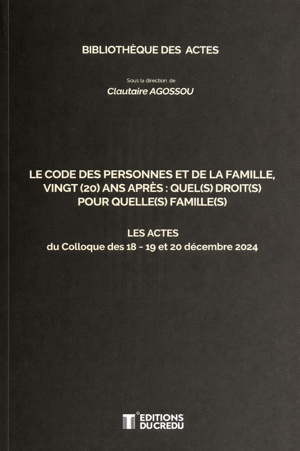 Le code des personnes et de la famille, 20 ans après, quel(s) droits pour quelle(s) famille(s) béninoise(s) ?, Les actes du Colloque des 18 – 19 et 20 décembre 2024, Les Edtions du Credij, 2025, 687 pages.